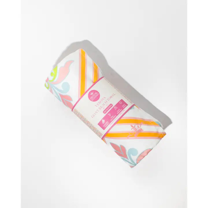 Enjoy a splash of color with our Verona Giant Beach Towel! Its white and multicolor design is perfect for relaxing at the beach, by the pool, or on summer getaways.