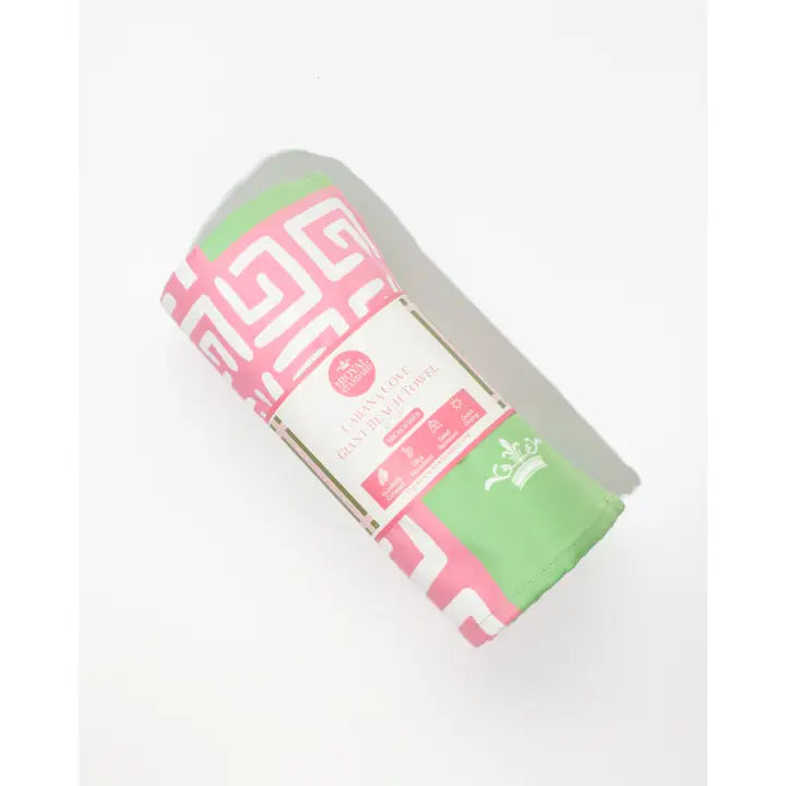 Relax in vibrant style with our Cabana Cove Giant Beach Towel! Its green, pink, and white design brings a fun, tropical feel to beach days, poolside lounging, or summer getaways.