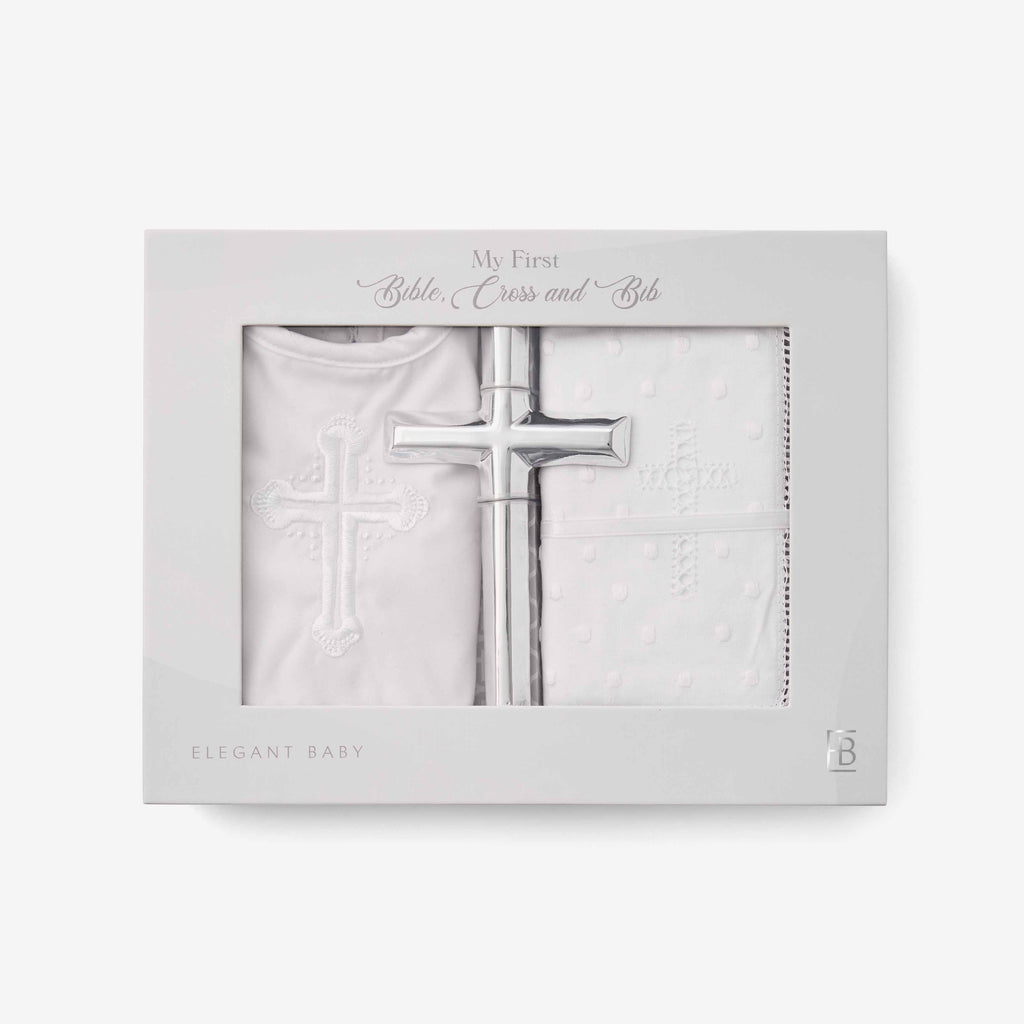 -‚- Presented in a beautiful baby gift box that reads 'My First Bible, Cross & Bib' this beautifully designed heirloom set is the perfect luxury Christening gift for any baby. Sweet swiss-dot cotton details further elevate this luxury Christening gift set while giving it a vintage, heirloom look with modern feel.