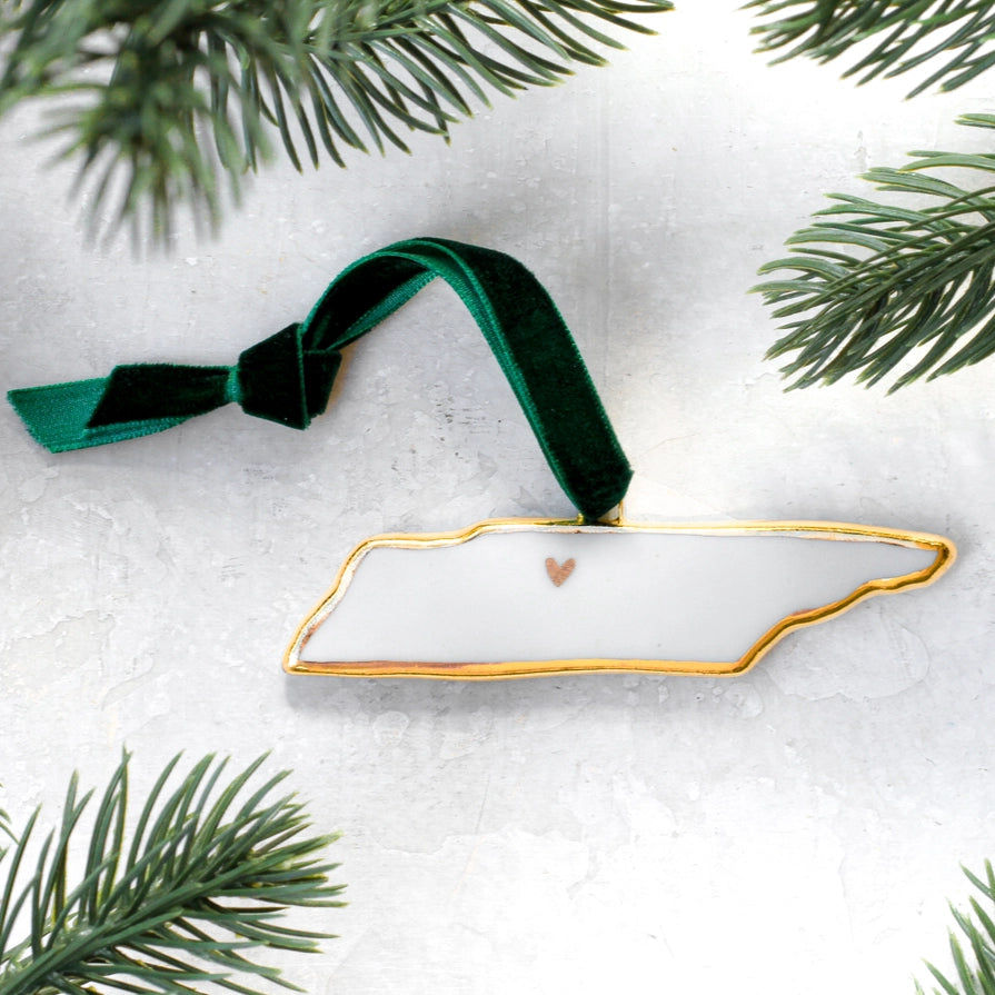 Each ornament features a delicately placed gold heart on the capitol. The ornaments are suspended from a velvet green ribbon.