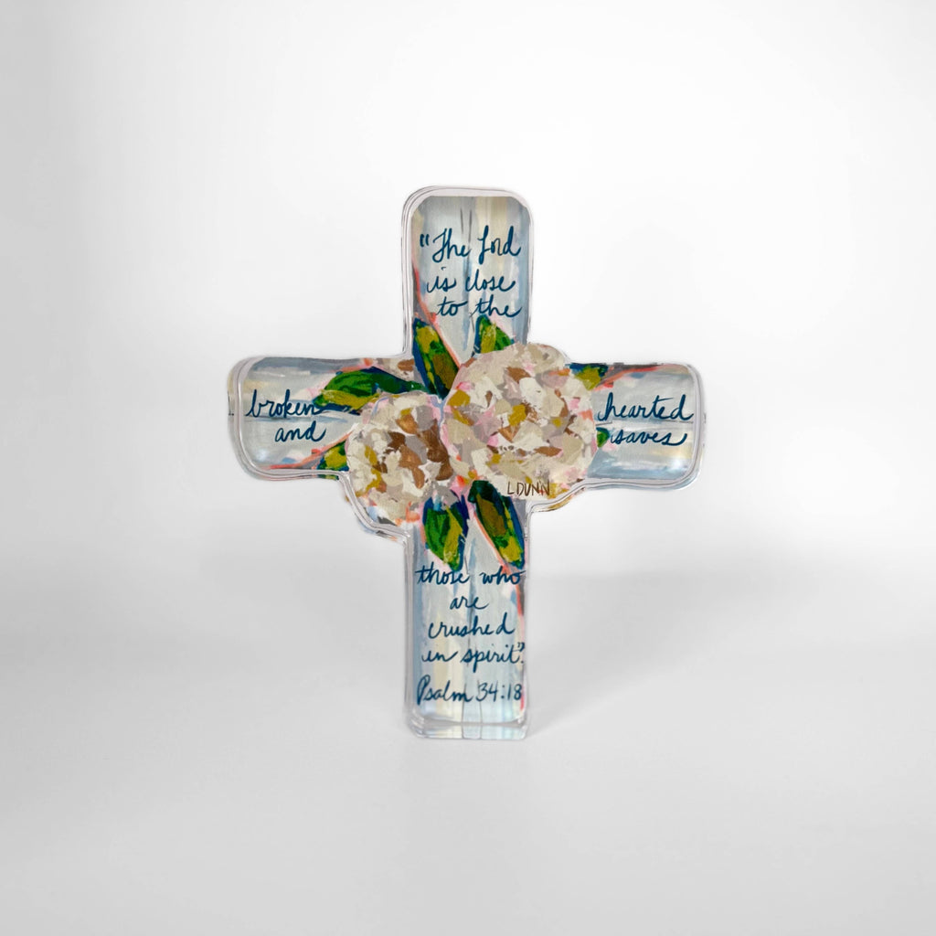 Our acrylic crosses are created as meaningful keepsakes for the many seasons and moments of life — to encourage, comfort, celebrate, and inspire. Each design reflects Lauren’s heart for combining faith and art, offering a gentle reminder of hope wherever it’s placed. Our Comfort Cross is a tender reminder of God’s nearness in difficult seasons. It features the verse Psalm 34:18 — “The Lord is close to the brokenhearted and saves those who are crushed in spirit.” This piece is meant to bring reassurance and peace, whether given as a thoughtful gift or kept close as a personal reminder of comfort and faith. Details • Size: 5" tall • Thickness: .75" acrylic • Printed acrylic with polished edges • Free-standing, cut-to-shape design • Ready to display on any flat surface