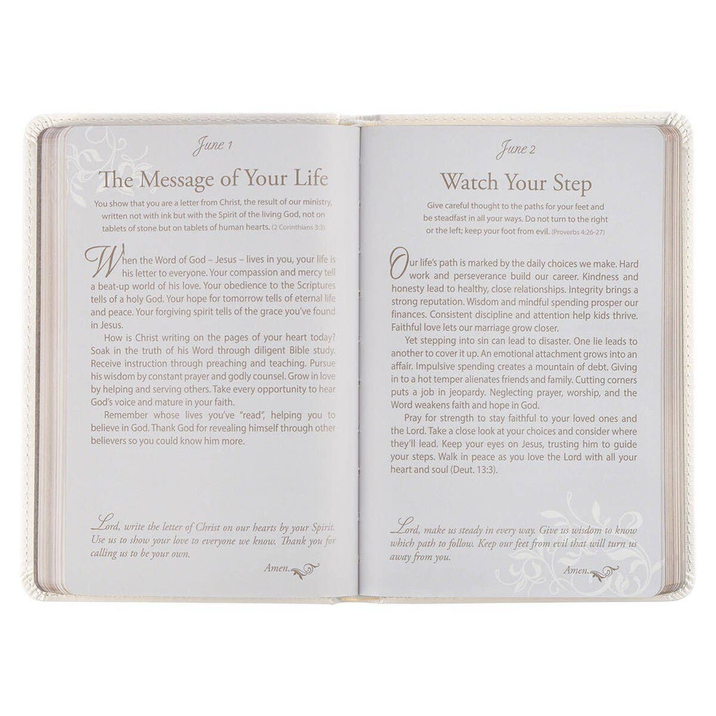 The Mr. & Mrs. 366 Devotions for Couples White Faux Leather Devotional is a great starting point for a new marriage and the perfect way to get into the habit of sharing your devotional time as a couple.