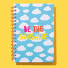 This notebook includes the motivational phrase "Be the Sunshine" with clouds in the background on the durable, hard cover.